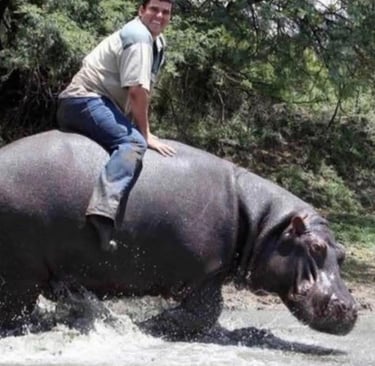 Half a world away in South Africa, the story of Marius Els parallels that of Ndata in many ways. Marius embarked on a journey of compassion that led him to rescue a baby hippo. From that moment on, he forged a bond with the creature as though it were his own kin—an act inspired by love, heeding the call of nature's wild spirit. He took his hippo on adventures, riding it like a horse and caring for it with unwavering affection, brushing its teeth and nurturing it as a proud caregiver.